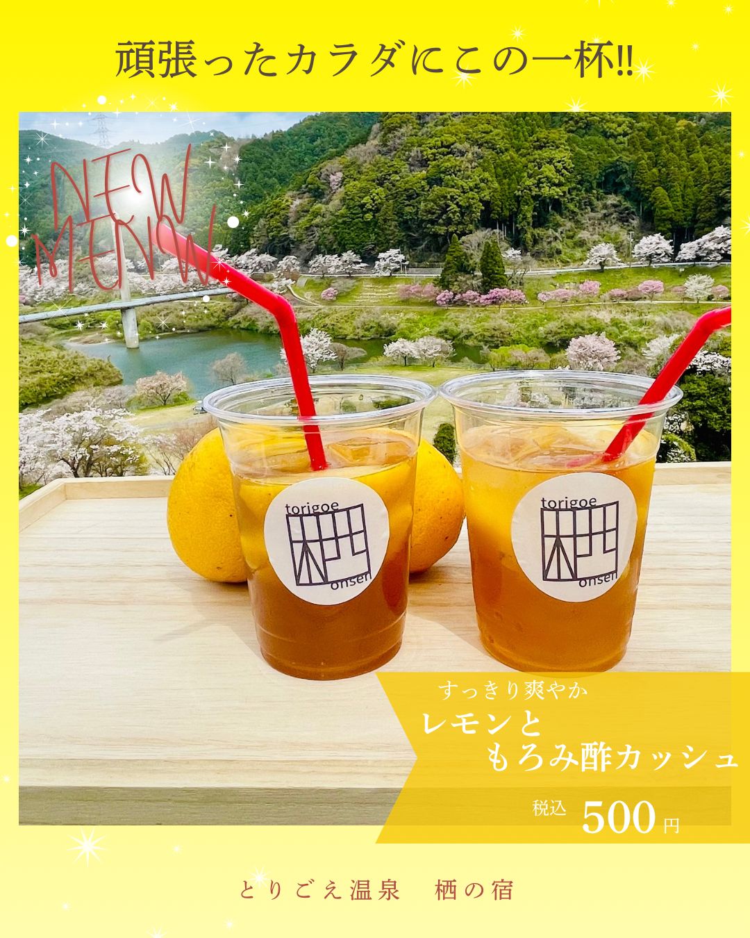 炭酸でキリッと割って、暑い季節にもぴったりのリフレッシュドリンクに仕上げた『レモンともろみ酢カッシュ』是非ご賞味ください。